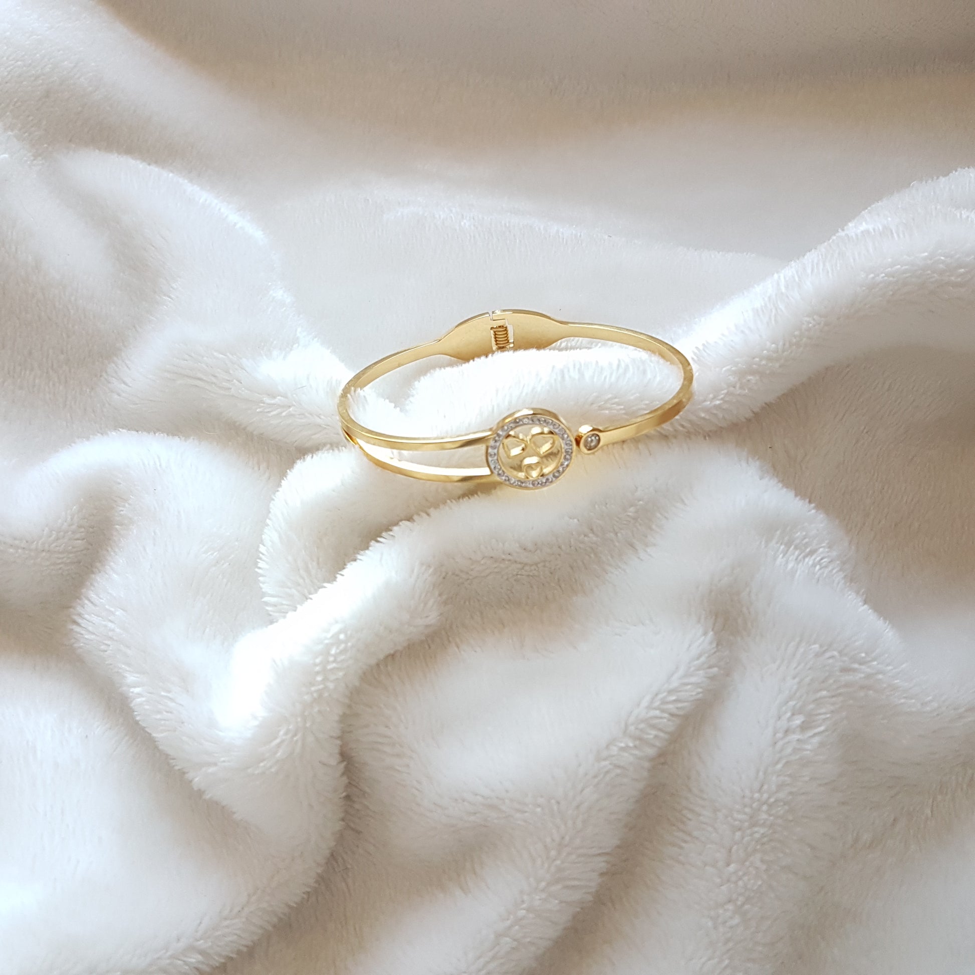 L'ouverture gracieuse du bracelet se niche entre le halo de strass et le strass solitaire,